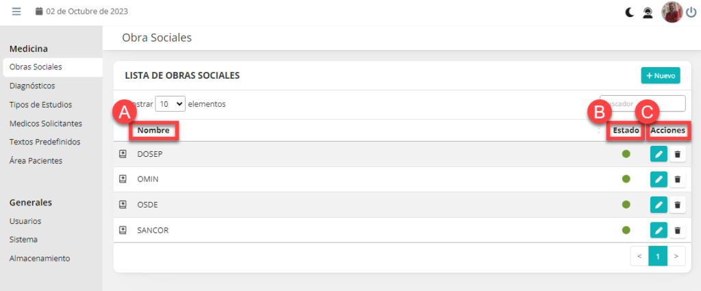 [B] Estado: si la obra social está activa, «icono de color verde», será visualizada para su posible asignación de un paciente, si el estado es inactivo, «icono de color gris», no va a estar disponible para su asignación.