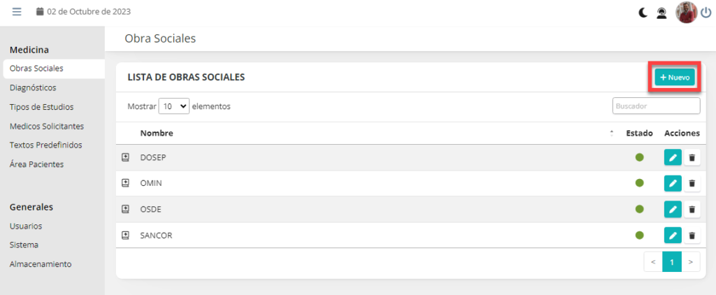 Para acceder al formulario de alta de una nueva «Obra social» debe hacer (click) en el botón “Nuevo”.