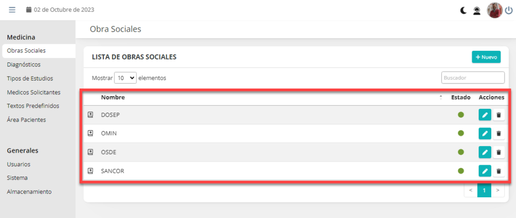 Una vez agendados los datos de las obras sociales, se mostrarán en la sección de «Lista de obras sociales».