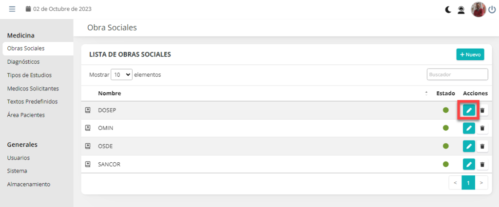 Para editar debe hacer (click) en el botón de «Edición» en el listado de «Obras sociales«.