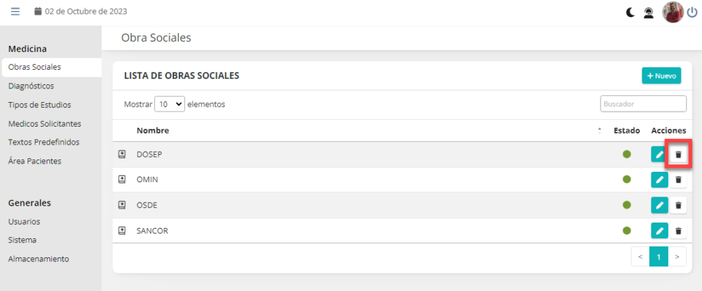 Para eliminar debe hacer (click) en el botón de «Eliminar» en la «Lista de obras sociales».