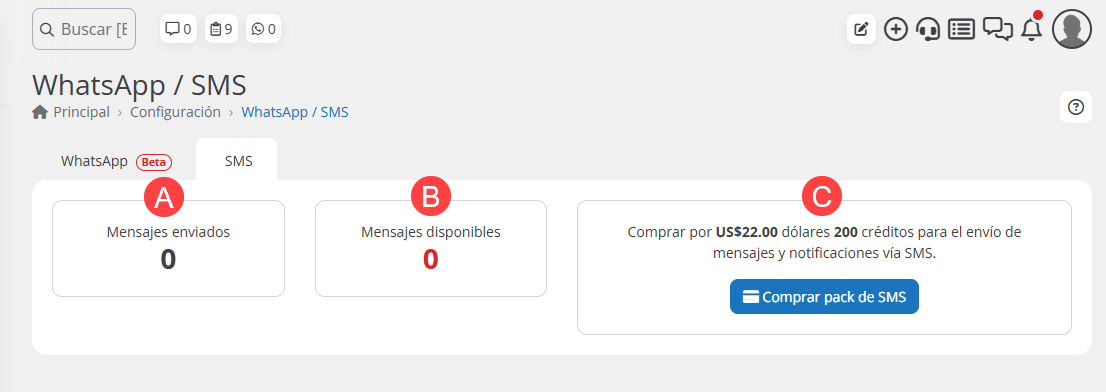 C Compra de pack de SMS: permite realizar una nueva compra de créditos.
