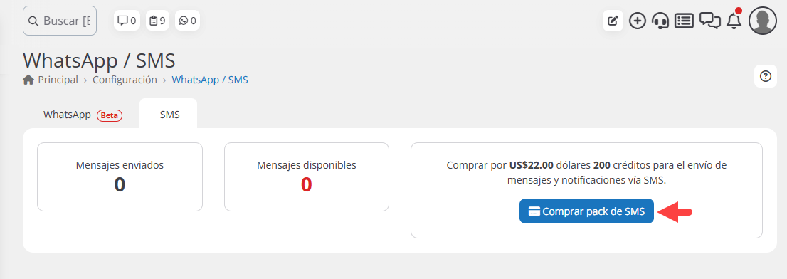 1. Dentro del panel de “SMS”, hacé clic en el botón “Comprar pack de SMS”.