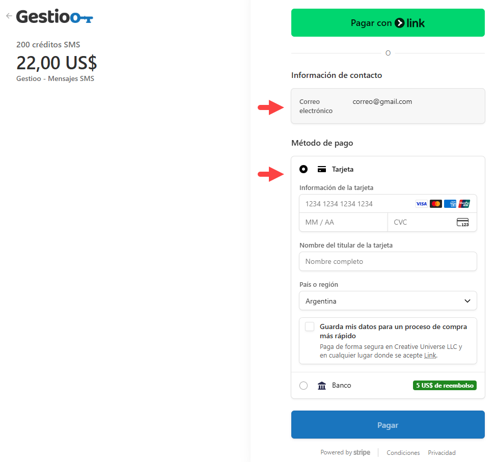 2. Completá el formulario ingresando tu correo electrónico y los datos de la tarjeta de crédito asociada a tu cuenta en Gestioo®.