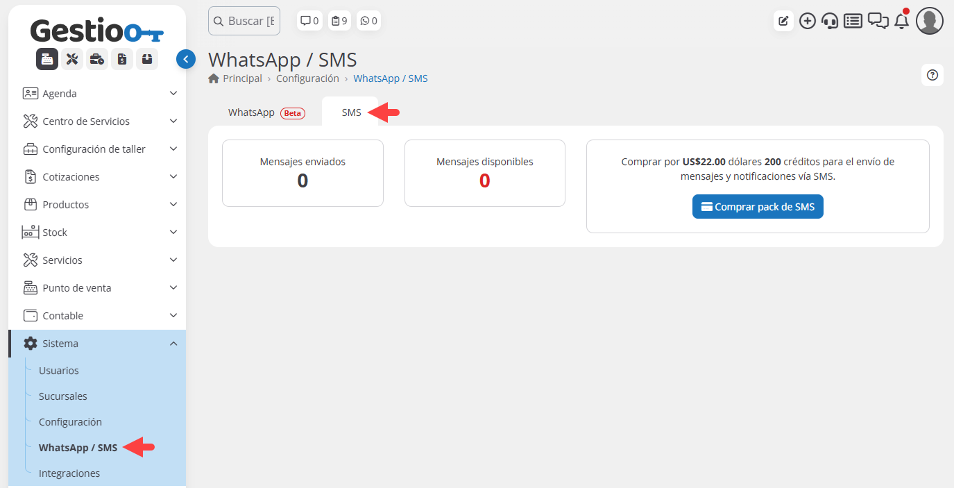 En esta guía, te proporcionaremos instrucciones detalladas para adquirir créditos de SMS dentro del sistema Gestioo®. Este servicio te permite enviar notificaciones automatizadas a tus clientes sobre el estado de sus órdenes de trabajo, incluyendo ingreso, egreso y aprobación digital.