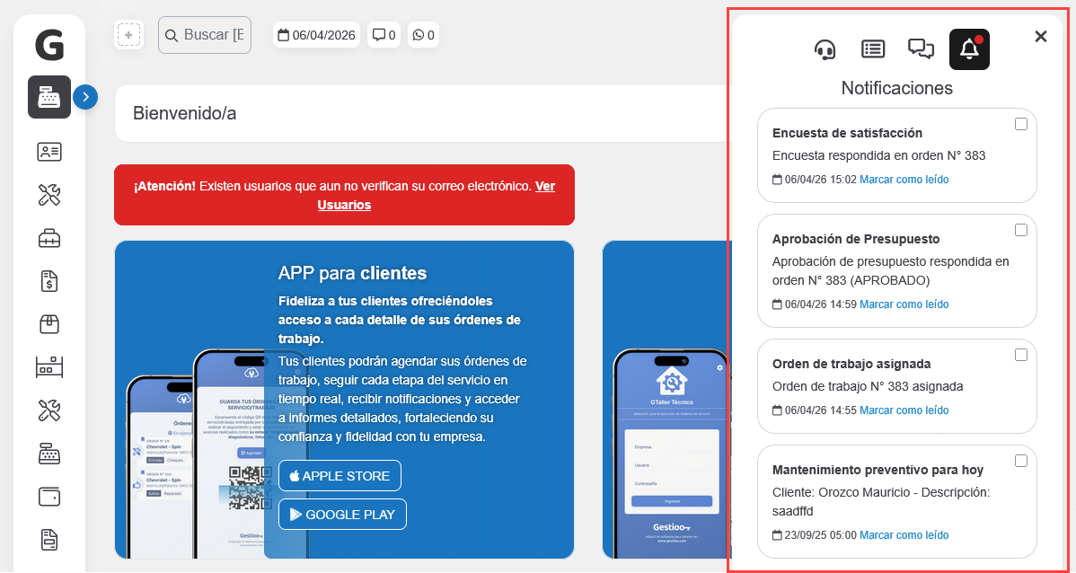 En esta guía, te proporcionaremos instrucciones detalladas para gestionar el Centro de Notificaciones de Gestioo®. Esta herramienta te permitirá mantenerte informado sobre los eventos más importantes del sistema, como asignaciones de órdenes de trabajo, respuestas de clientes, aprobaciones de presupuestos y aviso de mantenimientos preventivos, optimizando el seguimiento y control de tu operación diaria.