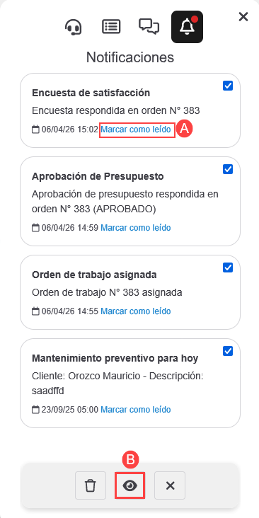 Para marcar una o varias notificaciones como leídas, podés utilizar cualquiera de las siguientes opciones: