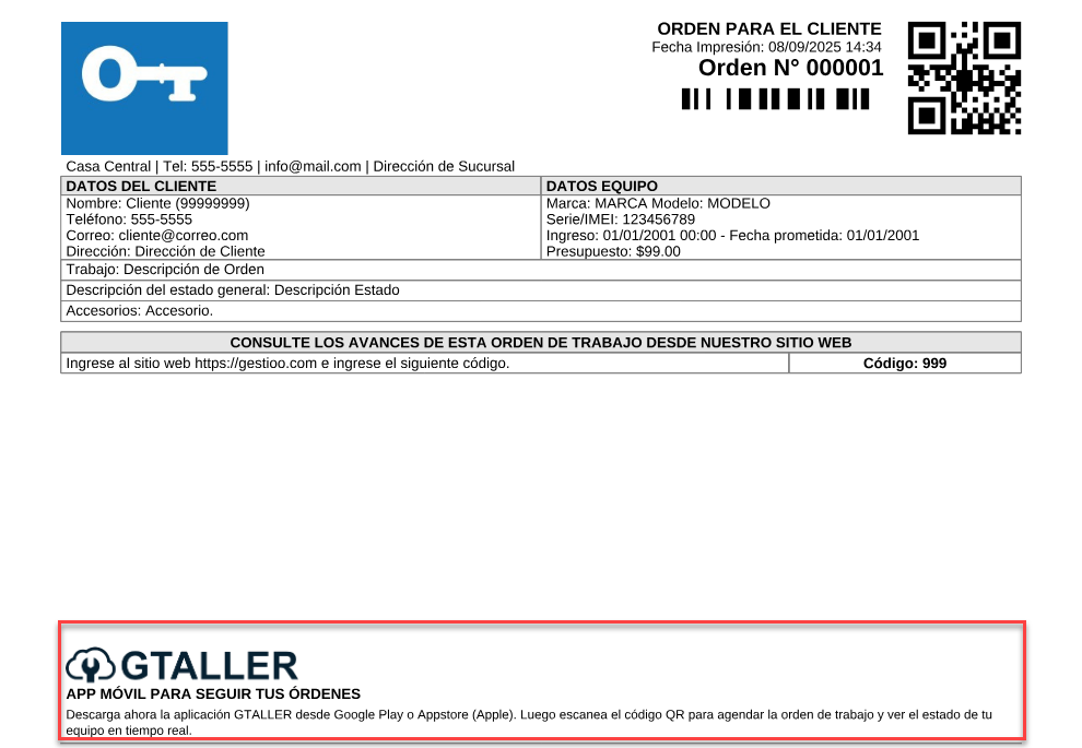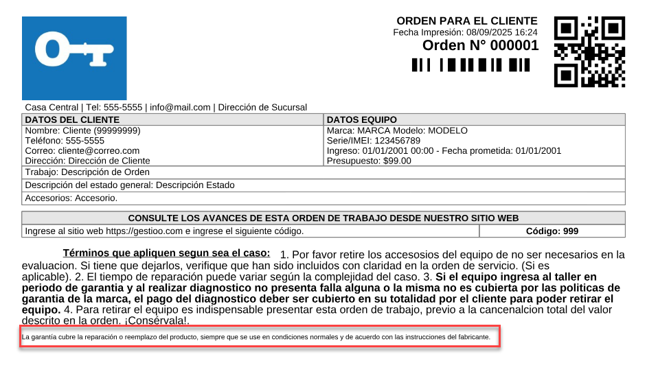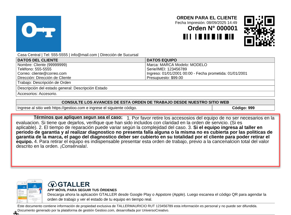 En este apartado podrás agregar un texto legal o cláusulas específicas relacionadas con el ingreso de equipos al taller.