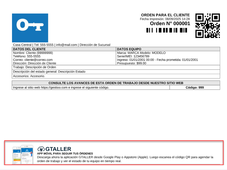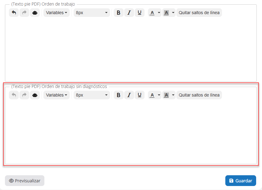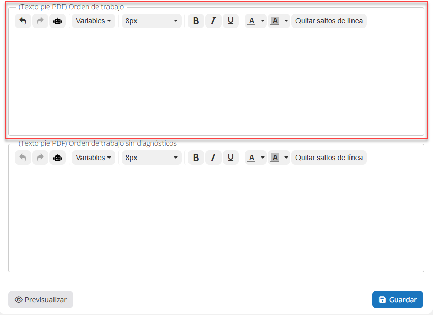 Permite personalizar el mensaje de pie en las órdenes de trabajo.