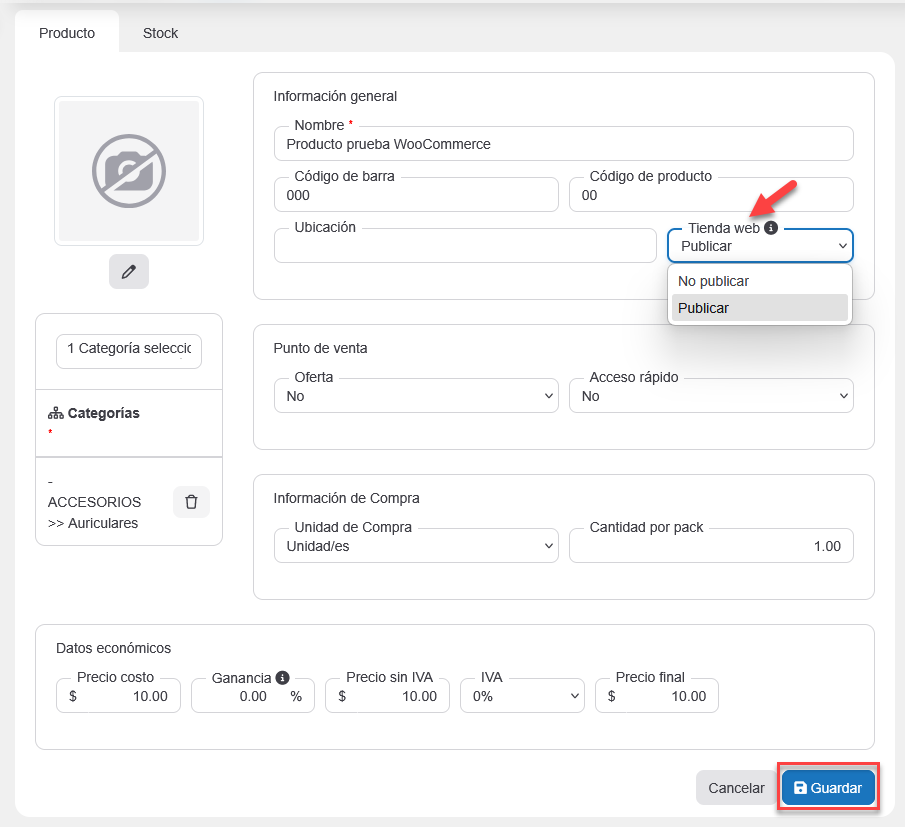 - Creá un nuevo producto en Gestioo® o seleccioná uno ya existente.