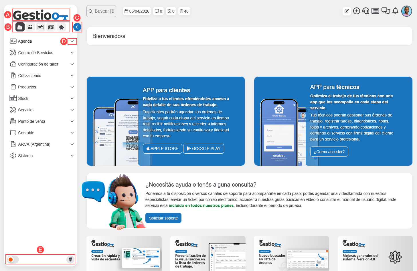C Botón para contraer/expandir el menú lateral: permite ocultar o mostrar el menú para optimizar el espacio de trabajo.