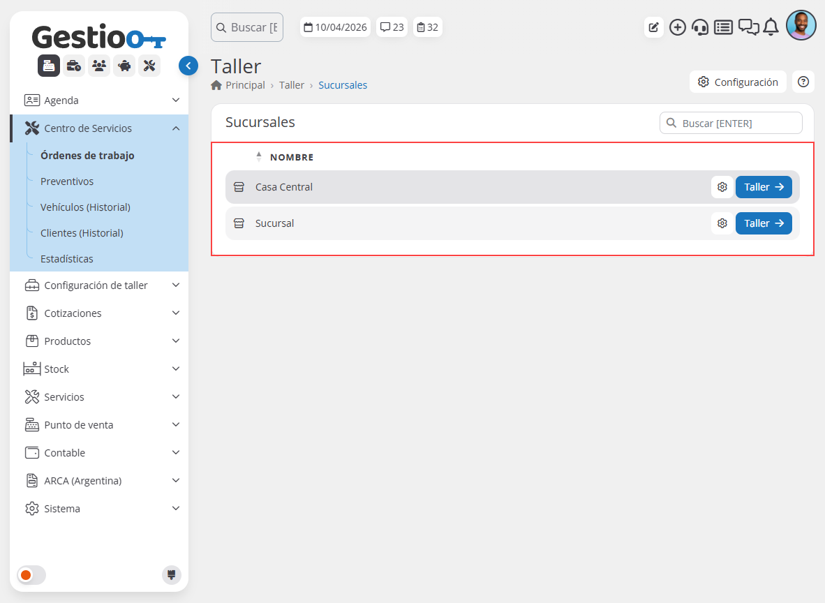 En algunas pantallas del sistema, se mostrará el nombre de la sucursal desde donde estás operando (disponible solo en módulos que requieren gestión por sucursales).
