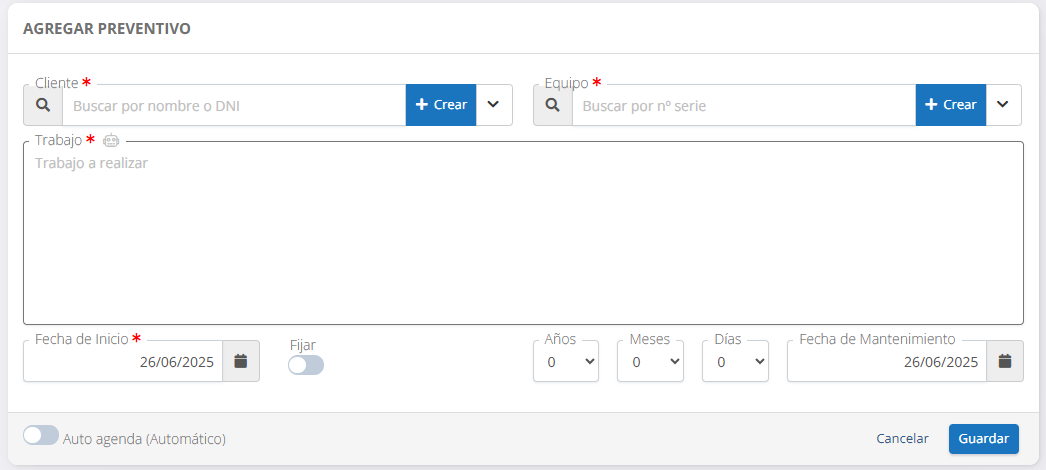 - Autoagenda: activa la generación automática del próximo mantenimiento.