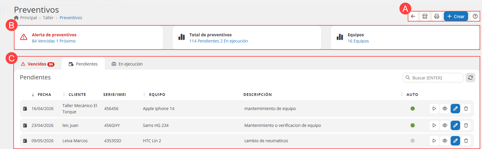 C Listado de preventivos, en el área seleccionada (en este ejemplo, área “Pendientes”):