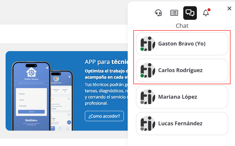 Para iniciar una conversación, haz clic sobre el nombre de un usuario para ingresar al canal de mensajería.