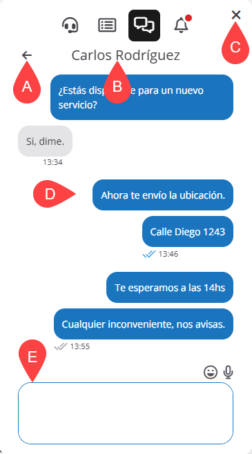 D Área de chat donde se visualizan los mensajes enviados y recibidos.