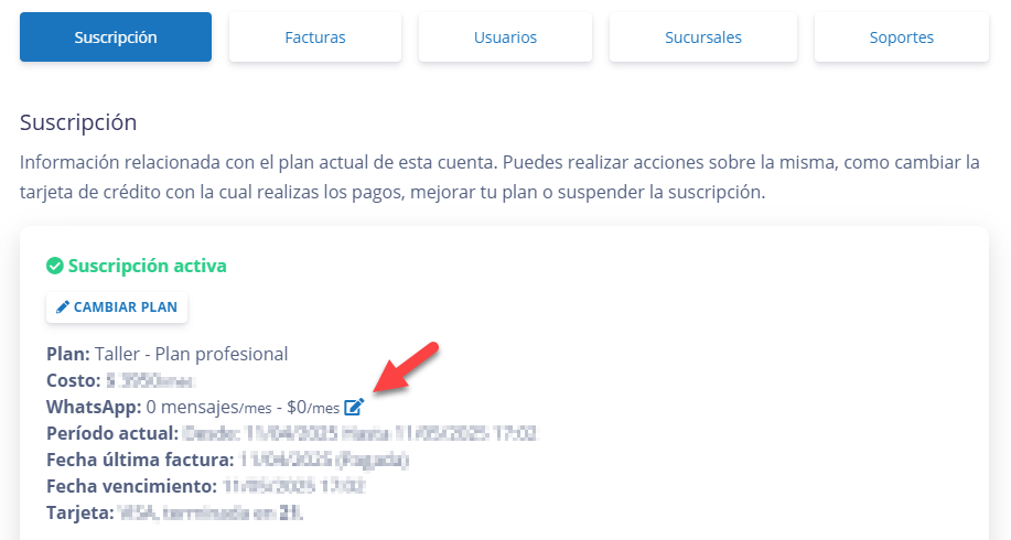 3. En la sección «Suscripción», localizá el apartado de créditos de WhatsApp.