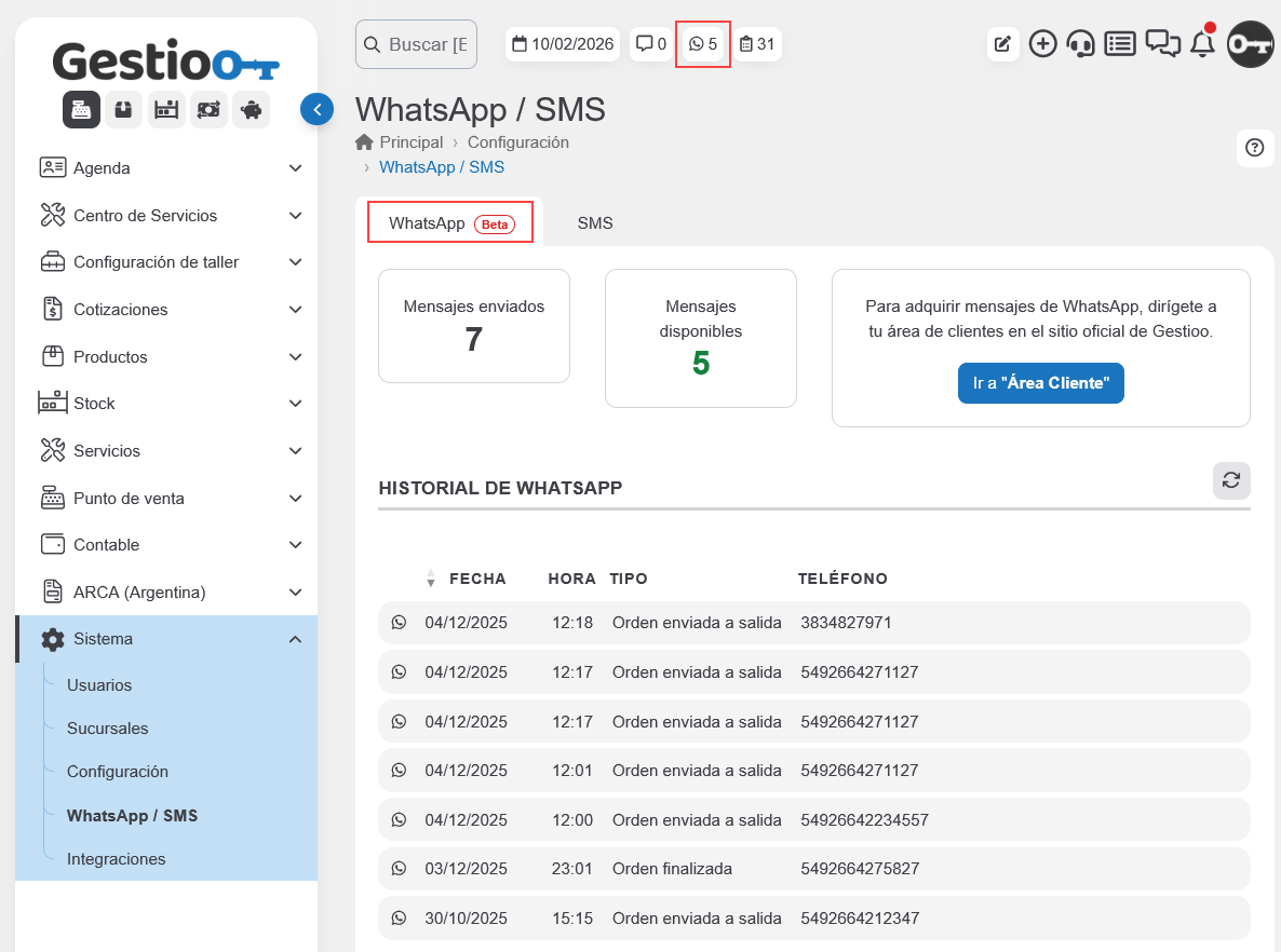 Una vez contratados los mensajes, podrás visualizar los créditos disponibles directamente desde la barra principal del sistema o desde el menú «Configuraciones» y hacé clic en la opción «WhatsApp / SMS».