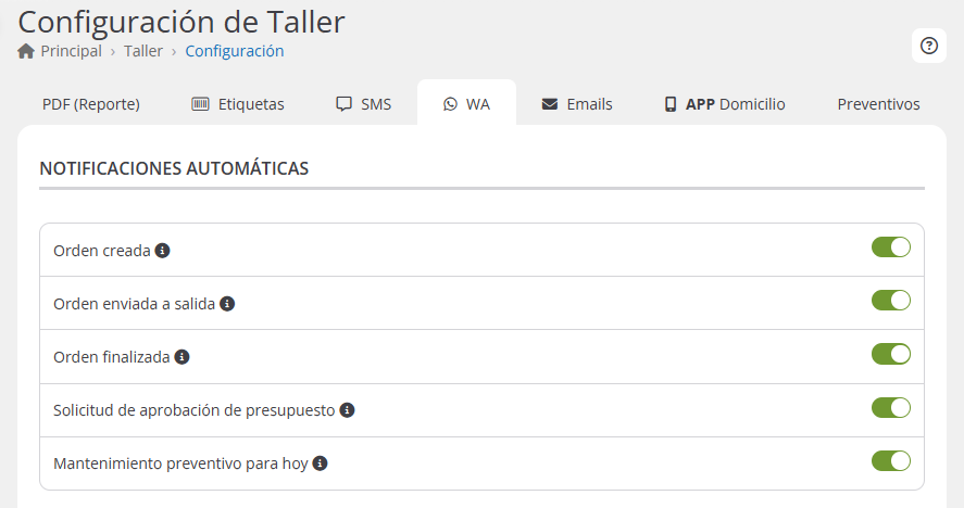 Una vez dentro del panel de WhatsApp, vas a poder elegir qué notificaciones automáticas deseas activar. Las disponibles son:
